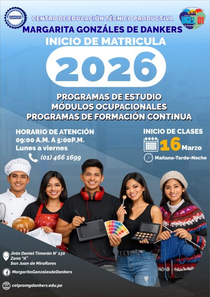 El CETPRO MARGARITA GONZALES DE DANKERS te invita a ser parte de la Matrícula 2026, donde podrás formarte en especialidades técnicas con alta demanda laboral, desarrollando habilidades prácticas para el trabajo, el emprendimiento y la inserción laboral.