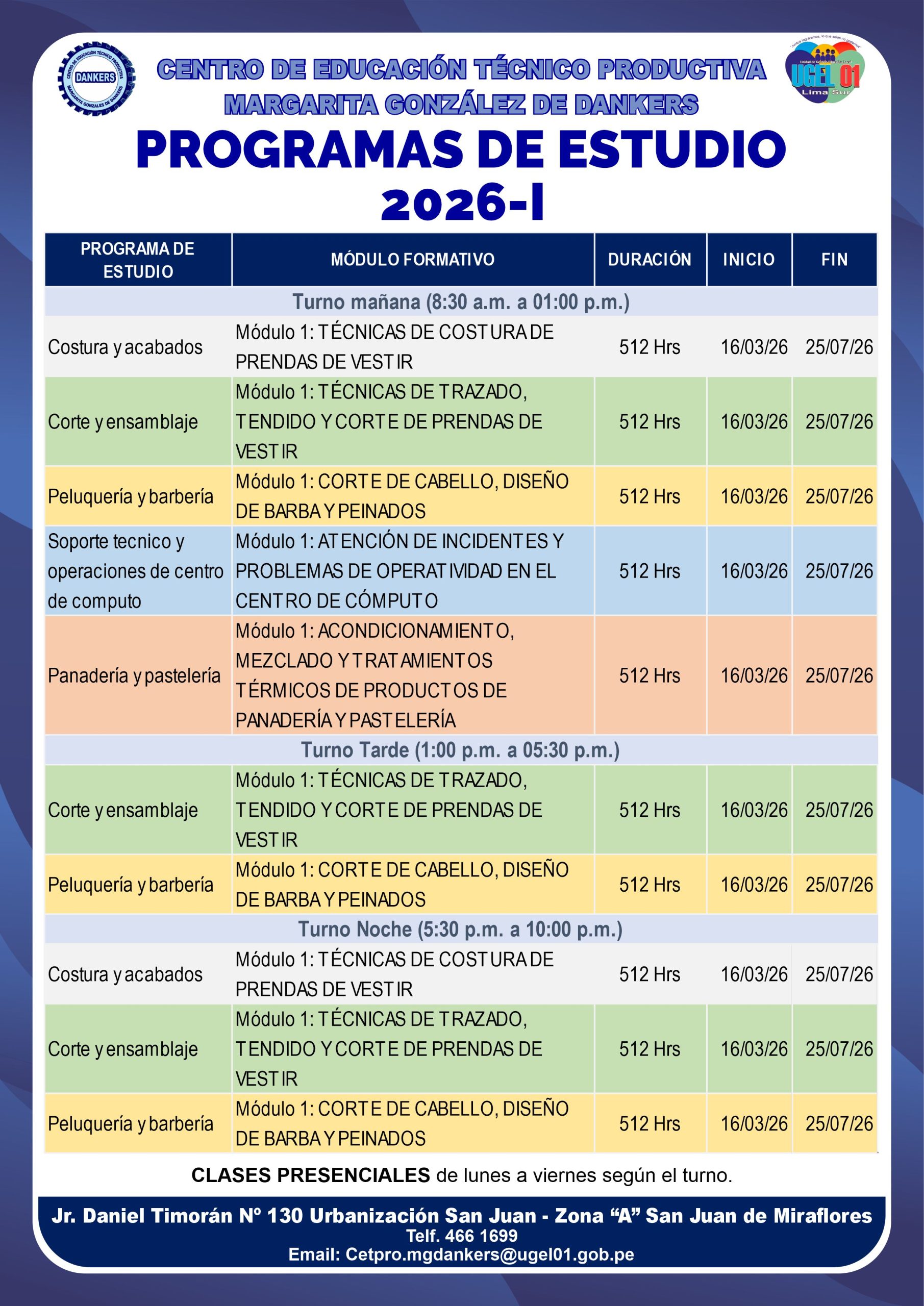 Se comunica a la comunidad en general que se da inicio al proceso de matrícula 2026 en el CETPRO MARGARITA GONZALES DE DANKERS, dirigido a jóvenes y adultos interesados en desarrollar competencias técnicas para el trabajo y el emprendimiento.